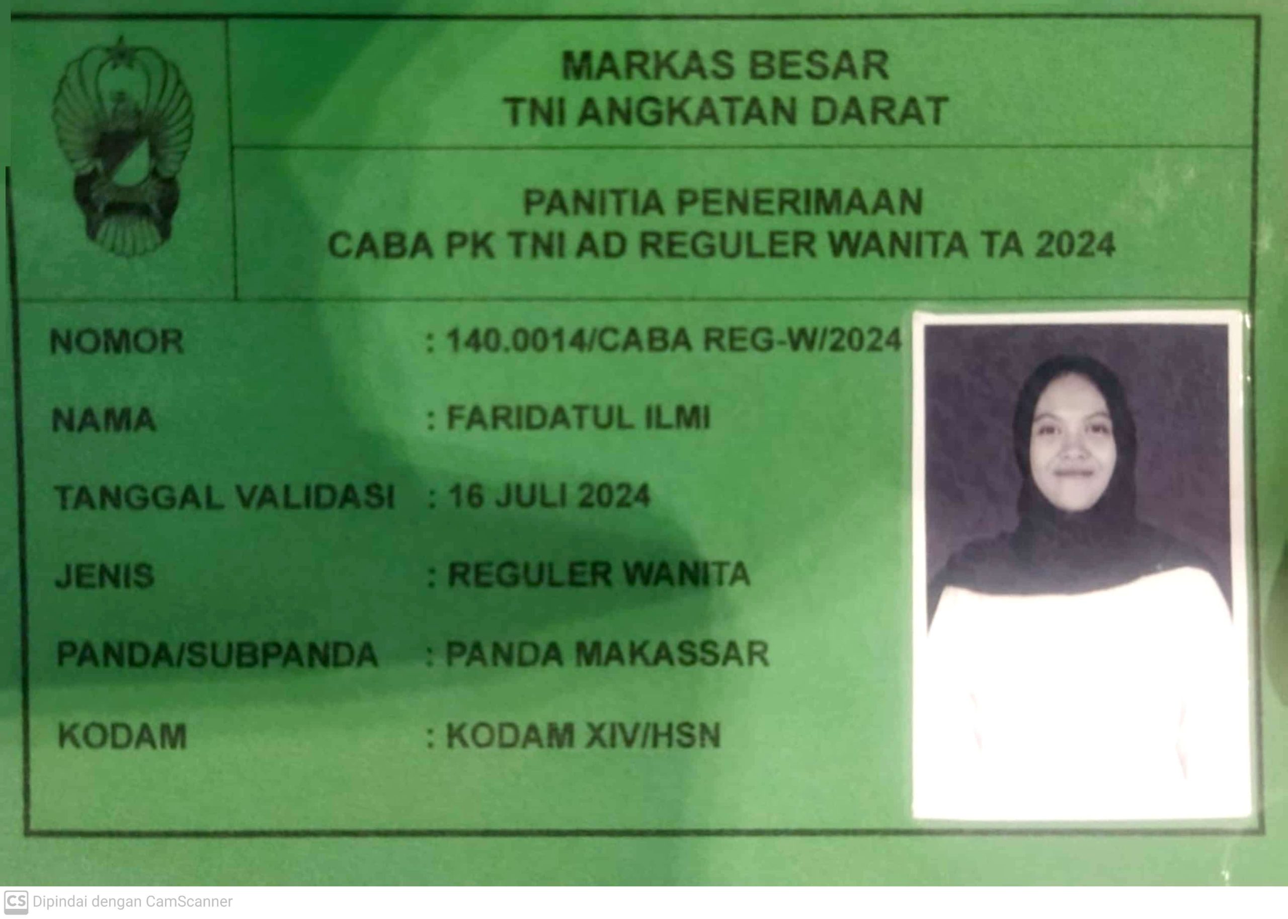 Sinjai_PB– Faridatul Ilmi, gadis asal Dusun Topangka, Desa Bulukamase, Kecamatan Sinjai Selatan, Kabupaten Sinjai, Sulawesi Selatan, mematangkan niat melangkah menuju cita-cita menjadi anggota Korps Wanita Angkatan Darat (KOWAD).