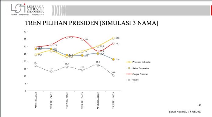 JAKARTA_PB--- Lembaga Survei Indonesia (LSI) melakukan simulasi head to head dua nama kandidat capres, yaitu Menteri Pertahanan Prabowo Subianto lawan Gubernur Jawa Tengah Ganjar Pranowo.