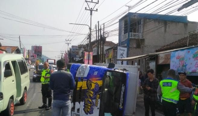 GARUT_PB--- Sebuah mobil Isuzu box yang dikemudikan DK (37) mengalami kecelakaan di Jalan Raya Kadungora, Kabupaten Garut, Selasa (18/4/2023). Sebelum terbalik, mobil box tersebut terlibat tabrakan dengan mobil Toyota Camry yang mengalami pecah ban.