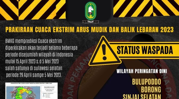 SINJAI_PB--- Menjelang puncak arus mudik lebaran 2023, Badan Metereologi, Klimatologi dan Geofisika (BMKG) merilis peringatan dini ancaman cuaca ekstrem yang masih berpotensi terjadi di beberapa wilayah termasuk di Kabupaten Sinjai.