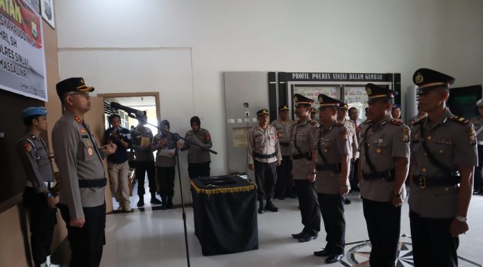 SINJAI_PB--- Kepala Kepolisian Resor Sinjai Ajun Komisaris Besar Polisi (Akbp) Rachmat Sumekar,S.Ik,M.Si pimpin upacara serah terima jabatan Kasat Reskrim dan Kapolsek Sinjai Selatan bertempat di ruang lobby Pratasara Wirya Mapolres Sinjai. Rabu (5/4/2023).