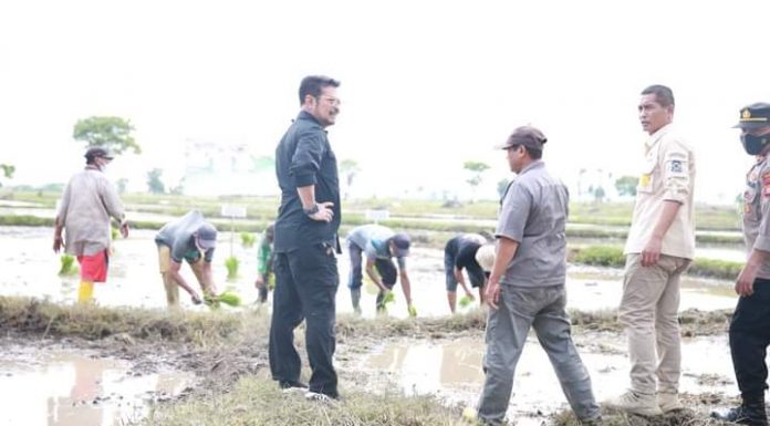 JENEPONTO _PB--- Menteri Pertanian Syahrul Yasin Limpo menggelar Tanam perdana padi sekaligus pencanangan perdana indeks pertanaman (IP) 300 atau penanaman 3 kali setahun (padi-Padi-jagung).